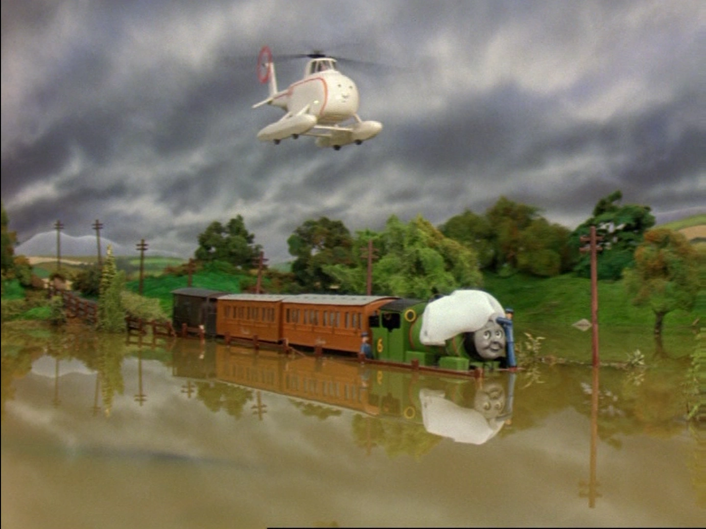 Cuando Percy comienza su viaje de regreso, lucha hacia adelante a través de los pueblos costeros y la campiña. La fuerte lluvia hace que el río crezca muy rápido. La visibilidad es pésima para Percy mientras se enfrenta a los elementos, pero hay problemas por delante; las vías se han inundado y, cuando Percy carga contra las aguas de la inundación, su fuego se apaga cuando el agua inunda su cabina. Luego, su tripulación intenta encontrar más leña y su fogonero le pide al guarda algunas tablas del suelo del furgón de cola. El guarda se queja de que justo había barrido el piso esa mañana, pero aun así accede a ayudar. El fuego de Percy pronto arde bien y se siente más cómodo de nuevo. Pronto ve a Harold, quien cree que ha venido a reírse de él. Una caja unida a un paracaídas se cae y cae sobre la caldera de Percy, que son bebidas calientes que Harold cuidadosamente le ha dado a la tripulación bebidas calientes (a lo que Percy agradece a Harold antes de que el helicóptero se vaya volando).